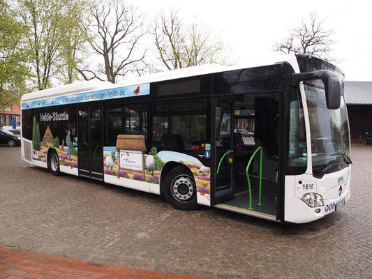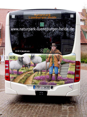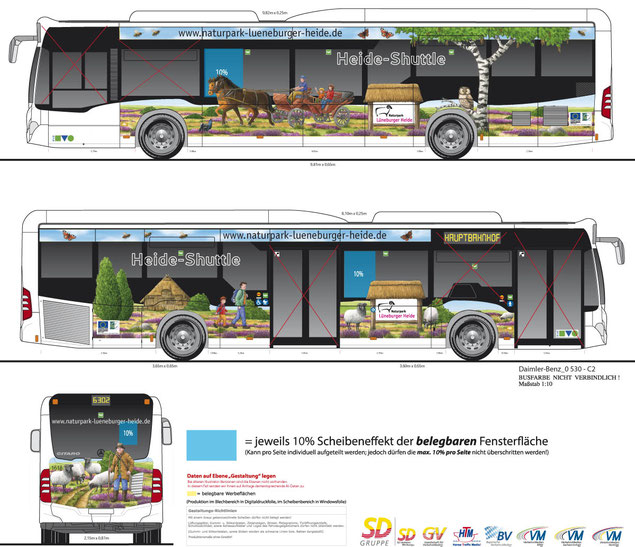 Konzeption, Layout, Satz, Illustrationen und Druckvorlagenerstellung für eine Streifenwerbung des Naturparks Lüneburger Heide auf einem Bus der KVG Stade.